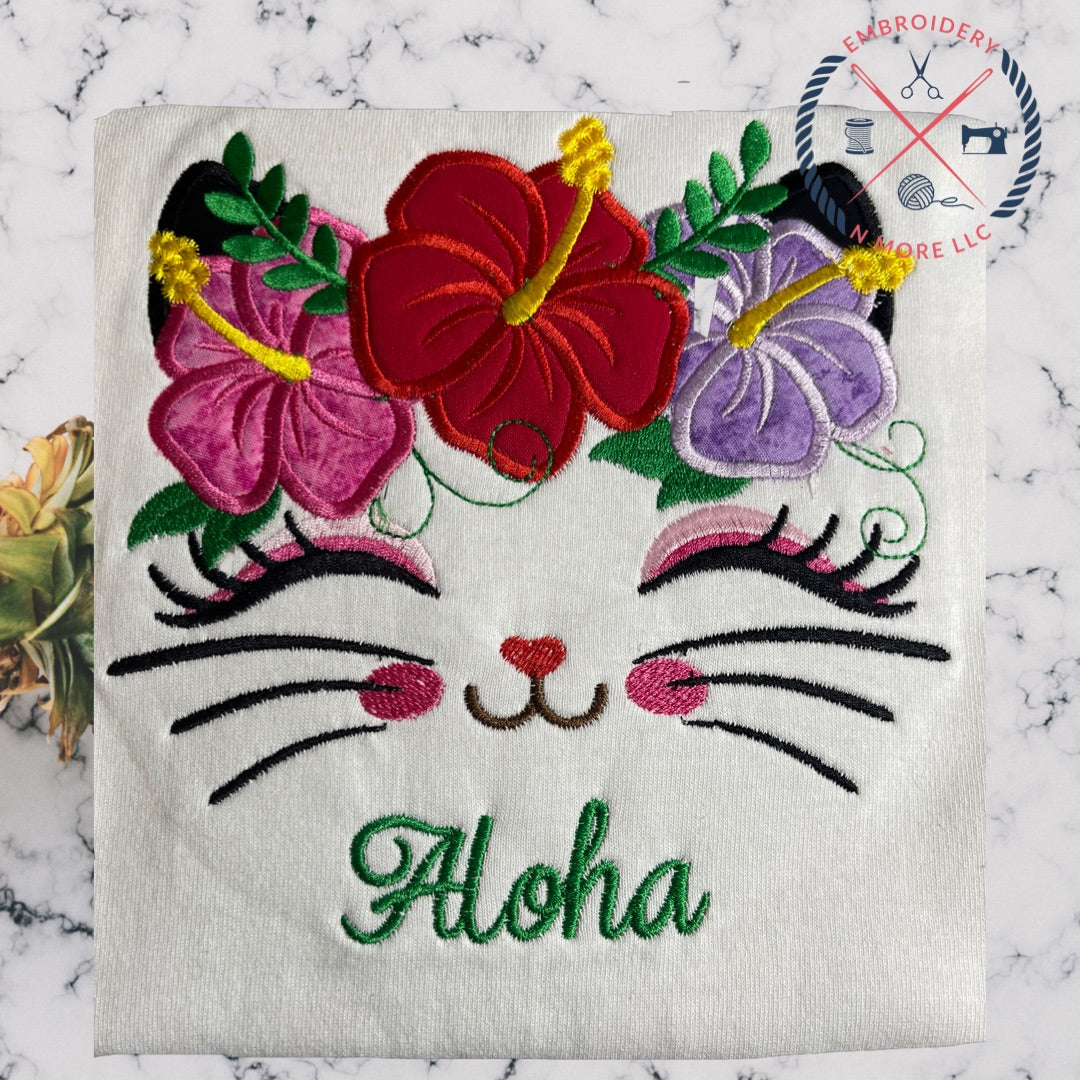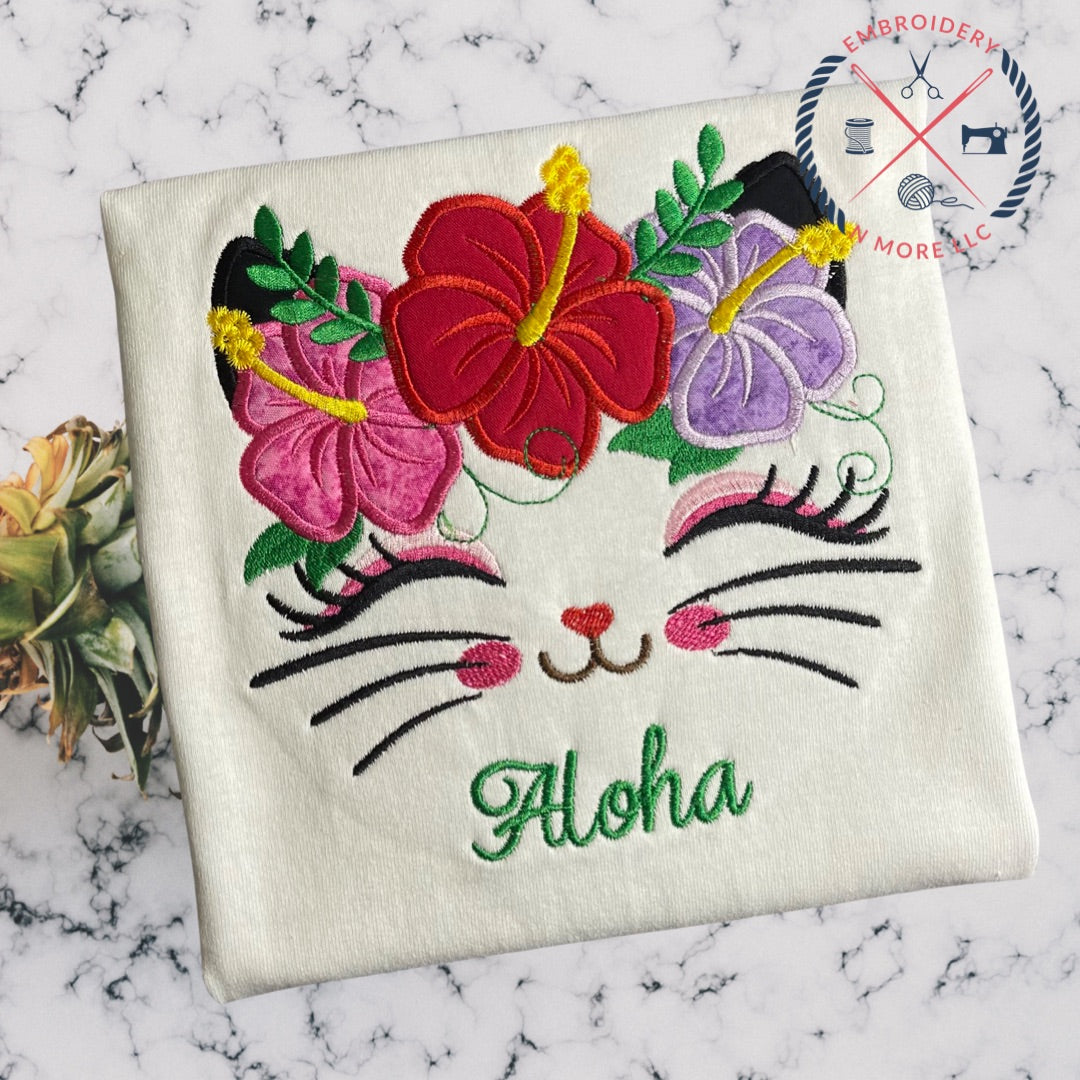 Hawaiian Themed Cat Face with Hibiscus Crown Embroidered/Applique T-Shirt