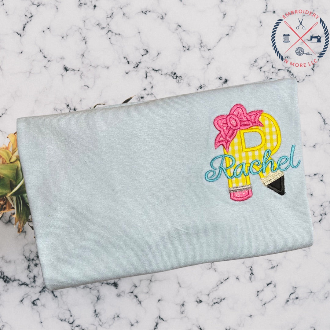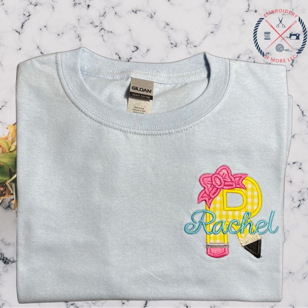 Pencil Initial with Name Applique/ Embroidered T-Shirt